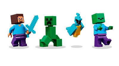 Мініфігурки Стіва, Кріпера й зомбі надихають на творчу гру й бойові дії. Серед автентичних аксесуарів LEGO Minecraft є човен, вудка, риба, папуга й листя джунглів.